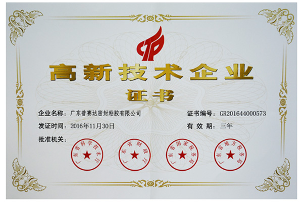 廣東普賽達(dá)密封粘膠有限公司榜上有名通過2016年國家高新技術(shù)企業(yè)復(fù)審。