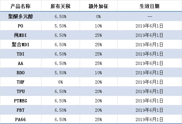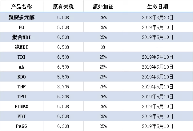 表一:美國對自中國進口PU原材料額外加征關稅的情況