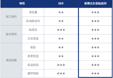 針對負極材料的特性,惠州普賽達研發(fā)的負極粘結(jié)劑是丙烯酸酯共聚物乳液,有著40%固含和適當?shù)漠a(chǎn)品粘度,其優(yōu)異的粘結(jié)性能使其添加量優(yōu)于日本最高技術(shù)水平的SBR產(chǎn)品;具有優(yōu)異的加工性能,穩(wěn)定性好,且高速攪拌不易破乳;惠州普賽達負極粘結(jié)劑可針對客戶應(yīng)用場景,在合成共聚物中引入功能團,調(diào)整粘結(jié)劑Tg,改善低溫性能。