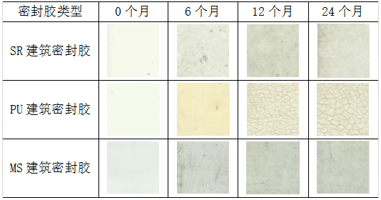 常用密封膠主要有硅酮(SR)建筑密封膠、PU建筑密封膠和MS建筑密封膠等[6],其結(jié)構(gòu)與優(yōu)缺點(diǎn)對(duì)比見表1,其中SR建筑密封膠以線性聚硅氧烷為主要原料制成,其主鏈由Si-O-Si(鍵能為444 kJ·mol-1)組成,在固化過程中交聯(lián)劑與基礎(chǔ)聚合物反應(yīng)形成網(wǎng)狀的Si-O-Si骨架結(jié)構(gòu),具有優(yōu)異的耐候性,是玻璃幕墻首選;但其表面不能涂飾,且成分中的硅油會(huì)滲透、擴(kuò)散到接縫周圍,吸附空氣中灰塵后產(chǎn)生污染。聚氨酯(PU)建筑密封膠以聚氨酯預(yù)聚體為主要成分制成,其主鏈主要由C-O(鍵能為339 kJ·mol-1)和N-C(鍵能為284 kJ·mol-1)組成,具有可涂漆,對(duì)基材無污染,與混凝土粘接性好等特點(diǎn);缺點(diǎn)為耐老化性能相對(duì)較差[7]。硅烷改性聚醚(MS)建筑密封膠以端硅烷封端聚醚為基礎(chǔ)樹脂制備,主鏈為C-O,C-C(鍵能為348 kJ·mol-1)和Si-O-Si鍵,具有固化不產(chǎn)生氣泡,施工性良好,可涂漆,除不能用于玻璃幕墻外,其他建筑幕墻領(lǐng)域均滿足耐候性要求。PC外墻為混凝土預(yù)制結(jié)構(gòu),屬疏松性基材,密封膠直接受陽(yáng)光(陽(yáng)光下強(qiáng)紫外線能量可達(dá)399 kJ·mol-1 )直射,對(duì)耐候性要求較高,采用SR建筑密封膠易造成污染,且不利于后期涂漆裝飾;采用PU建筑密封膠易由于密封膠老化、粉化和硬化等情況導(dǎo)致密封部位防水失效。表2不同建筑密封膠自然氣候老化后外觀??梢钥闯觯琍U建筑密封膠曝曬12個(gè)月后,出項(xiàng)明顯的開裂現(xiàn)象,SR建筑密封膠和MS建筑密封膠曝曬24個(gè)月后外觀良好,均沒有出現(xiàn)開裂情況。綜合對(duì)比可知,PC外墻密封應(yīng)優(yōu)先采用MS建筑密封膠。