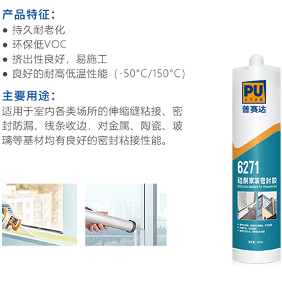 6271 為單組分濕氣固化密封膠,采用中性硅酮膠作為原料, 對(duì)環(huán)境無(wú)污染,與金屬、陶瓷、玻璃、石材等多種基材具有良好的密封粘接性能。