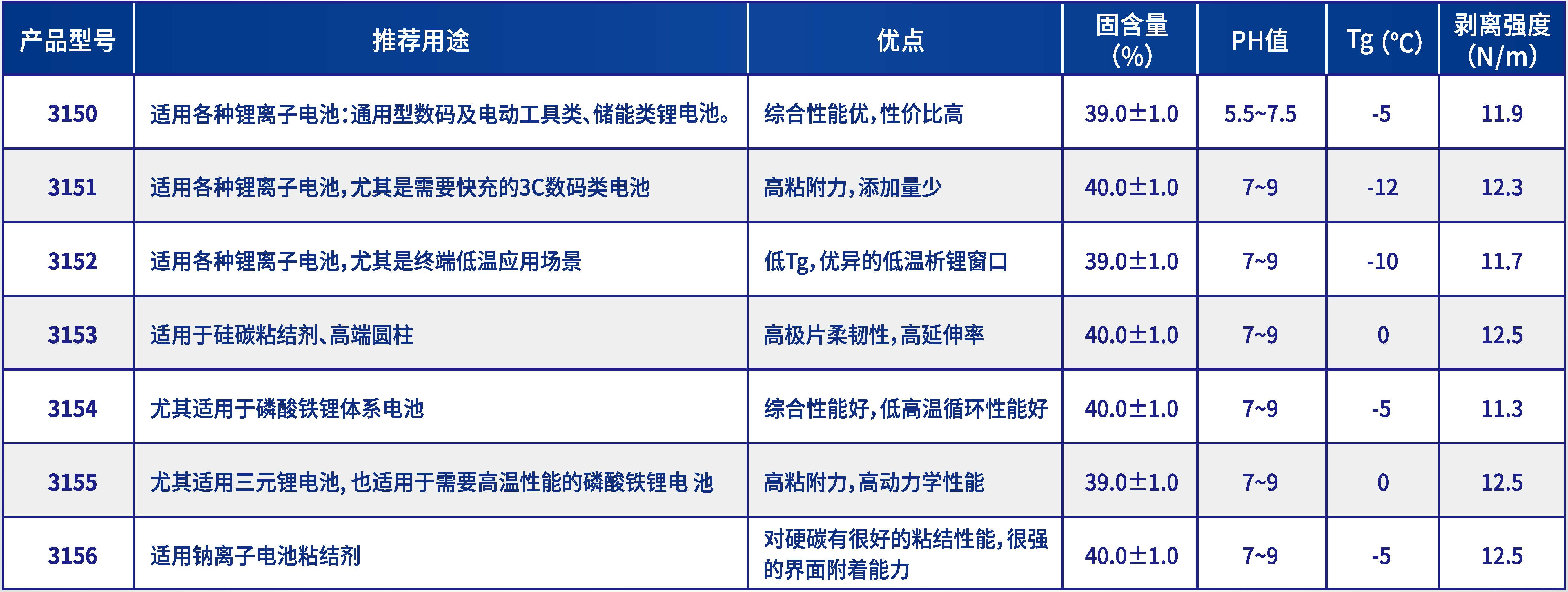 3150、3151、3152、3153、3154、3155、3156為第三代負(fù)極粘結(jié)劑,是以苯乙烯、類丁二烯、丙烯酸及丙烯酸酯為主要單體進(jìn)行共聚,為乳液聚合水性乳液。