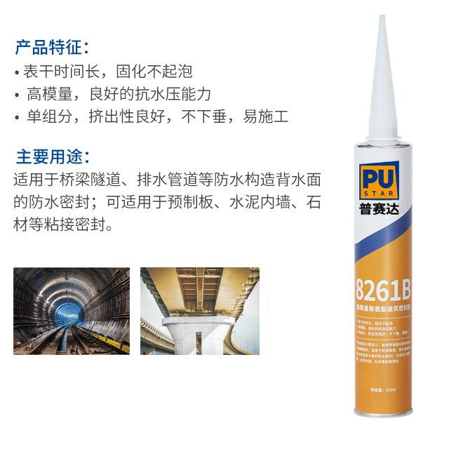 適用于橋梁隧道、排水管道等防水構造背水面的防水密封;可適用于預制板、水泥內(nèi)墻、石材等粘接密封。
