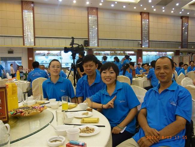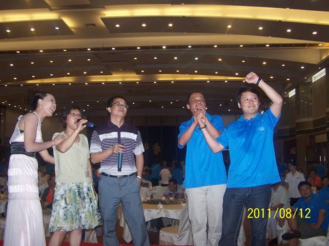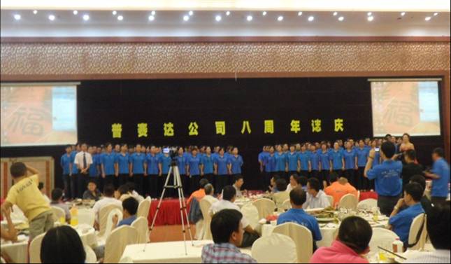 第三部分,慶典晚宴。8月12日晚6點(diǎn)慶典晚宴在天天漁村進(jìn)行,總經(jīng)理及嘉賓代表共同開(kāi)啟生日香檳、切開(kāi)生日蛋糕。我們普賽達(dá)人與到場(chǎng)約七十位嘉賓舉杯同慶普賽達(dá)8周歲生日。晚宴的高潮部分莫過(guò)于由普賽達(dá)人自編自導(dǎo)的文娛節(jié)目。盡管文娛表演沒(méi)有華麗的舞臺(tái)布置及燈光效果,但絲毫沒(méi)有影響我們整場(chǎng)晚會(huì)節(jié)目的表現(xiàn)力。節(jié)目首先以公司全員大合唱《不要認(rèn)為自己沒(méi)有用》拉開(kāi)序幕,大合唱激情的表演力感動(dòng)了在場(chǎng)的全體嘉賓;第二個(gè)節(jié)目是資材部極具新意與看點(diǎn)的《產(chǎn)品時(shí)裝秀》表演,自制的道具、恰到好處的臺(tái)詞解說(shuō)及舞臺(tái)動(dòng)作設(shè)計(jì)、夸張的表演獲得了臺(tái)下觀眾一次又一次熱烈的掌聲和歡呼聲,不僅如此,嘉賓沈春林教授還特意上臺(tái)為資材部這個(gè)節(jié)目做了現(xiàn)場(chǎng)采訪,使這個(gè)《產(chǎn)品時(shí)裝秀》真正要表達(dá)的含義植入了觀眾的心底;市場(chǎng)部男女二人合唱《變臉》,其中男生劉輝不似明星卻勝似明星的歌聲再一次把晚會(huì)氣氛推向了高潮,他的歌聲低沉有力、余音繞梁,深深地打動(dòng)了臺(tái)下觀眾的心弦,給我們留下了深刻的印象。