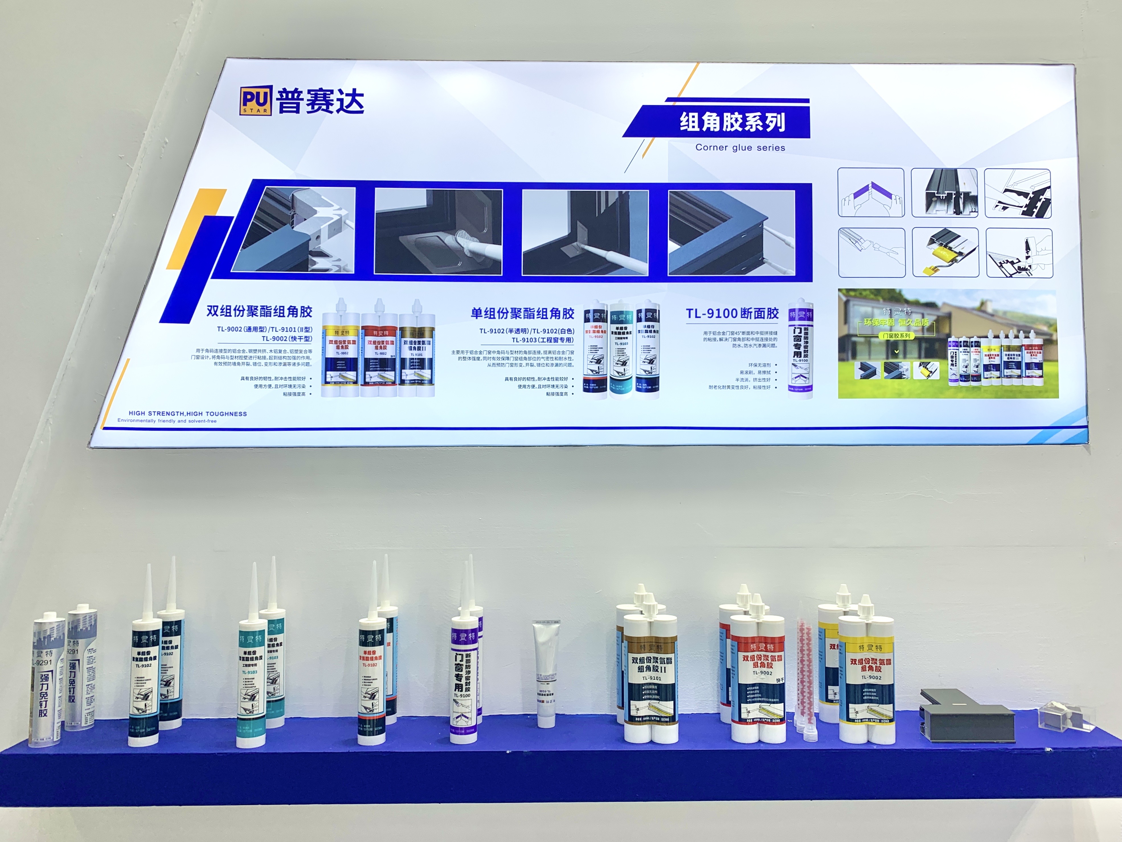 本屆展會(huì),普賽達(dá)攜建筑全系列膠粘劑產(chǎn)品亮相,諸如建筑工程用25LM低模量的改性硅酮密封膠、耐候高性能的聚氨酯密封膠;內(nèi)裝用0級(jí)防霉無(wú)甲醛的硅酮膠;能夠牢固粘接多種基材的MS膠。除了展示經(jīng)典的建筑系列膠粘劑,鋁門(mén)窗專(zhuān)用組角膠的展出也成為了此次展會(huì)的一大亮點(diǎn)。