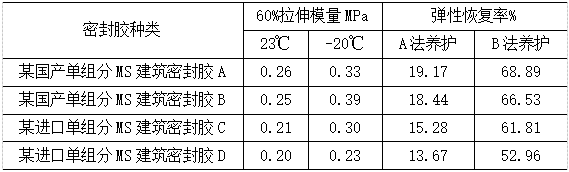 單組分MS建筑密封膠的基礎(chǔ)聚合物反應(yīng)活性相對(duì)較低,徹底反應(yīng)完全所需時(shí)間相對(duì)較長(zhǎng),如果標(biāo)準(zhǔn)給定的養(yǎng)護(hù)時(shí)間不夠,基團(tuán)反應(yīng)不徹底,密封膠內(nèi)部交聯(lián)程度不夠,彈性恢復(fù)率表現(xiàn)較低。采用JC/T 881-2001[7]對(duì)比4款國(guó)內(nèi)外MS建筑密封膠彈性回復(fù)率測(cè)試結(jié)果可知,按照A法養(yǎng)護(hù),測(cè)試結(jié)果(見表3)不符合標(biāo)準(zhǔn)要求,采用GB/T 22083-2008[8]對(duì)單組分MS建筑密封膠進(jìn)行分級(jí),最高只能符合該標(biāo)準(zhǔn)中的12.5 P類型產(chǎn)品要求,結(jié)果為塑性材料,而實(shí)際的MS建筑密封膠為彈性密封膠,明顯欠妥;如果按照B法養(yǎng)護(hù),彈性恢復(fù)率可達(dá)到60%以上,符合GB/T 22083-2008標(biāo)準(zhǔn)中的20LM類型產(chǎn)品要求,測(cè)試結(jié)果為彈性材料。綜上所述,由于現(xiàn)今沒有專門針對(duì)MS建筑密封膠應(yīng)用的標(biāo)準(zhǔn),套用按應(yīng)用領(lǐng)域或分級(jí)界定的標(biāo)準(zhǔn)明顯欠妥,使得單組分MS建筑密封膠在建筑市場(chǎng)領(lǐng)域,尤其是PC外墻密封領(lǐng)域推廣異常困難。
