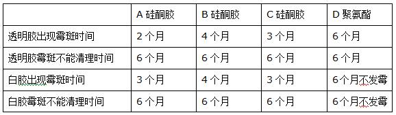 表一:集體飯?zhí)孟赐氤貎?nèi)部聚氨酯防霉膠與硅酮防霉膠防霉性能對比