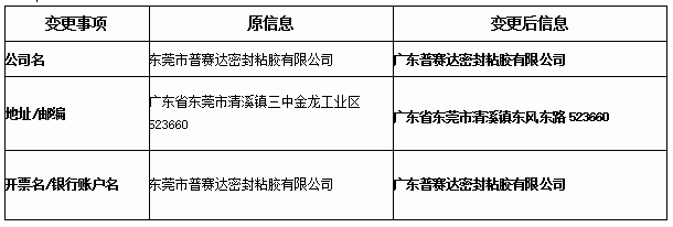 由于本公司發(fā)展需要,公司擴大經(jīng)營生產(chǎn),公司原名稱“東莞市普賽達密封粘膠有限公司”變更為“廣東普賽達密封粘膠有限公司”,具體變更信息如下: